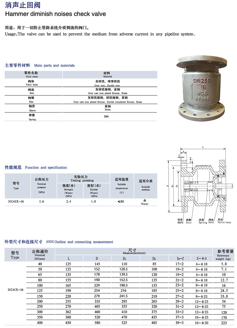 科威納消聲法蘭止回閥嚴格按 API6D、GB/T12235 標準設(shè)計制造,本系列閥門正常處于關(guān)閉狀態(tài),由于管線中進口端介質(zhì)的壓力作用,而克服彈簧阻力使閥門開啟。當進口端介質(zhì)壓力低于出口端時,彈簧將閥芯推向閥座而使閥門關(guān)閉,阻止介質(zhì)逆流,故起止回作用??仆{立式止回閥由于采用彈簧支撐閥芯,故采用立式安裝或臥式裝均可。立式止回閥廣泛應用于石油、化工、制藥、電力行業(yè)等各種工況的管路上。